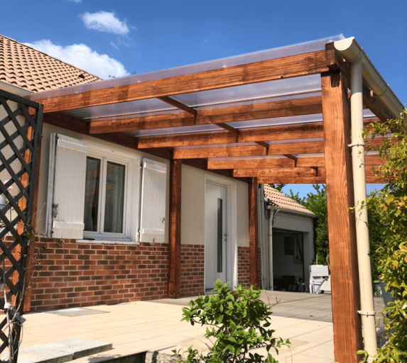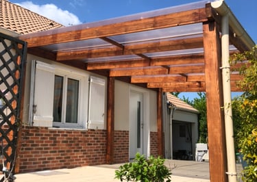 Création d'une avancée en bois, couverte par des toles en plexiglasse afin de garder la lumière du jour. Une structure durable et faite sur mesure à la demande du client.
